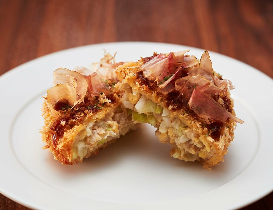 加熱することで甘味がでるおいしいキャベツに、玉子やイカすり身、鰹の旨味を合わせたお好み焼き風味のカツ。生姜の香りがほんのり感じられ、おかずにもおつまみにもおすすめの一品です。