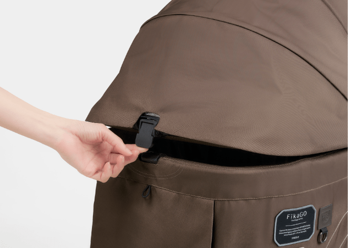 前後どちらからでも開閉できる幌は、毛の長いペットにもやさしい「バックル固定」を採用しました。