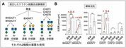 GnT-IX(MGAT5Bとも呼ばれる)3)は、脳に特異的に存在する糖転移酵素で、タンパク質に付いたO-マンノース(Man)型糖鎖4)と呼ばれる糖鎖に作用して、枝分かれ構造を作る酵素です(図1A)。これまでの研究で、GnT-IXを欠損したマウスでは脱髄5)疾患からの回復が早いことや、GnT-IXを欠損させたがん細胞では、脳腫瘍の一種であるグリオーマ6)の生育が抑えられることなどが報告され、GnT-IXが作る枝分かれしたO-Man型糖鎖と疾患との関わりが明らかになってきています。このように、GnT-IXと疾患との関わりがわかってきた一方で、O-Man型糖鎖がタンパク質の働きをどのように制御するのかはよくわかっていません。糖鎖は一般に、色々な形に伸びることで多彩な機能を発揮します。これまでに、枝分かれのないO-Man型糖鎖が様々な形に伸びることは知られていましたが、枝分かれしたO-Man型糖鎖がどのように伸びるのかは不明でした(図1B)。そこで本研究では、GnT-IX欠損(KO7))マウスを用い、枝分かれしたO-Man型糖鎖の伸長について調べました。