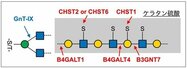 糖鎖1)とは、グルコースなどの糖(動物では約10種類の糖が存在)が枝分かれしながら鎖状につながったもので、多くはタンパク質や脂質などに結合した状態で存在しています。タンパク質に付いている糖鎖には様々な形のものがあり、タンパク質ごとに糖鎖の形が異なること、また同じタンパク質でも、臓器ごとに糖鎖が異なること、健康なときと病気のときとで糖鎖の形が変化することなどが知られています。特に、疾患特異的な糖鎖の変化は、実際に医療の現場でがんの診断などに使われており、糖鎖の変化をもたらす仕組みの解明は、医療応用を考える上でも重要です。