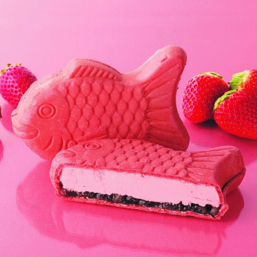 福岡県産あまおう苺の風味を活かしたまろやかな苺アイスと、北海道産小豆を使ったやわらかな自家炊き粒餡を、香ばしく口どけのよいピンク色のたい焼き最中で包みました。上品な甘さの粒餡となめらかな苺アイスが溶け合うおいしさを、頭からしっぽまでどこから食べても楽しめます。たい焼き最中アイスの季節限定バージョンとして、かわいい見た目も魅力のアイスです。