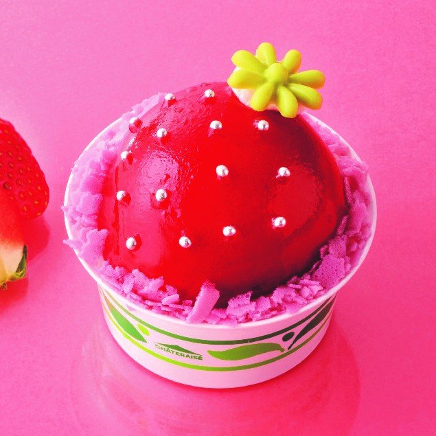 真っ赤な苺をモチーフにしたケーキです。ミルク感あふれるパンナコッタに、スポンジとダイス苺、マシュマロを重ね、やさしい甘さの苺ムースで包み込みました。アラザンで苺のつぶつぶを表現し、かわいらしさにもこだわった一品です。