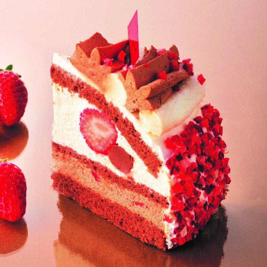 旬の苺に、チョコレートとキャラメルを組み合わせた、いちごフェア限定のケーキです。ミルキーなホワイトチョコクリームと、カカオ感を残しつつまろやかに仕上げたダークチョコクリームで、紅ほっぺ種苺を包み込みました。さらに、ビター感のあるキャラメルガナッシュを忍ばせ、味わいに奥行きをもたせています。