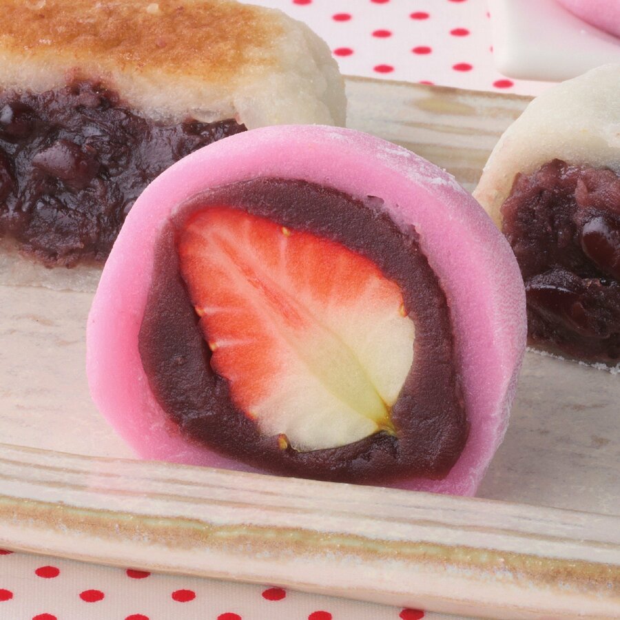ピンク色に色付けしたなめらかでやわらかい生地で、自家炊きこし餡と国産苺を丸ごと包みました。白州名水で炊き上げたこだわりの餡と、ジューシーな苺がやわらかな生地に包まれ、のど越しの良い食感が楽しめます。苺のおいしさと餡の風味が引き立つ、旬の大福です。
