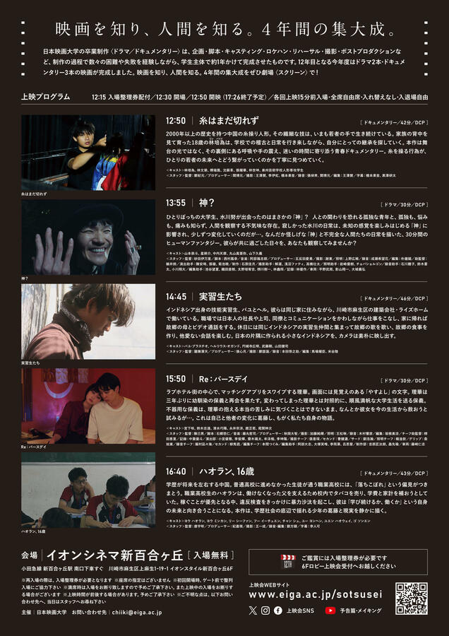 日本映画大学(川崎市麻生区/学長:天願大介)は2月7日(土)、イオンシネマ新百合ヶ丘で「第12回卒業制作上映会」を開催する。当日は一般の観客を迎え、施設内で最も大きな「スクリーン1」でドラマ2作品・ドキュメンタリー3作品を発表。上映前にはスタッフによる舞台挨拶も行われる。入場無料、事前申し込み不要。