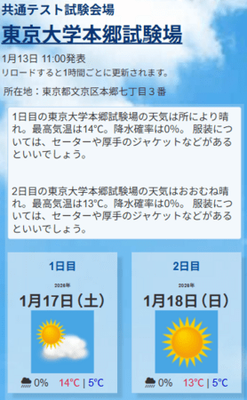東進ハイスクール・東進衛星予備校(以下、東進)を運営する株式会社ナガセ(本社:東京都武蔵野市 代表取締役社長 永瀬昭幸)は、頑張る受験生を応援するため、「共通テスト 全650試験会場のお天気」サイトを公開しました。大学入学共通テストが実施される2026年1月17日(土)・18日(日)の全650試験会場の天気や気温、服装アドバイス等をまとめた便利サイトです。簡単・スピーディーに最新情報を確認できます。