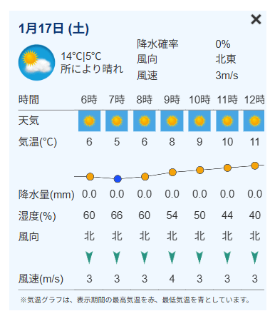 試験1日目、2日目それぞれの天気や気温、降水確率、服装のアドバイスがわかります。さらに、日にち部分をタップすると、1時間ごとの天気・気温・降水量・湿度・風向・風速といった詳細が見られます(PCの場合は画面下部に掲載)。天気は1時間ごとに更新されるので、ブックマーク登録しておくのもおススメです。
