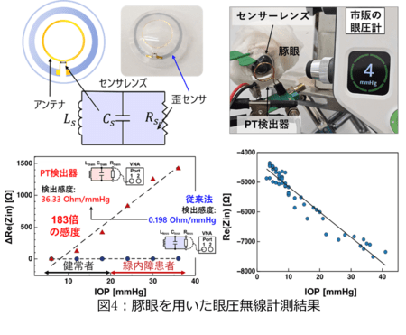 早稲田大学大学院情報生産システム研究科の三宅 丈雄(みやけ たけお)教授、アズハリ・サマン次席研究員らの研究グループと山口大学大学院医学系研究科眼科学講座の木村 和博(きむら かずひろ)教授、芦森 温茂(あしもり あつしげ)助教らの研究グループは、導電性高分子(PEDOT:PSS)と接着性高分子(PVA)からなる多層構造抵抗センサと、PT対称性の原理を利用した無線検出器を組み合わせることで、眼圧※1変化に応じた抵抗変化を高いQ値※2で読み取ることに成功しました。