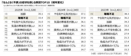 「なんとなく不調」の症状を感じる原因を経年で比較すると、2025年は1位「加齢」(2023年3位→2024年4位→2025年1位)が上昇し、昨年1位だった「やる気や元気が出ない」(同2位→1位→3位)が3位に下降しています。一方、今回2位の「睡眠不足」(33.4%)は、2024年が2位(37.0%)、2023年が1位(38.3%)と常に上位で、「なんとなく不調」の症状を引き起こす大きな要因と感じられているようです[図3]。