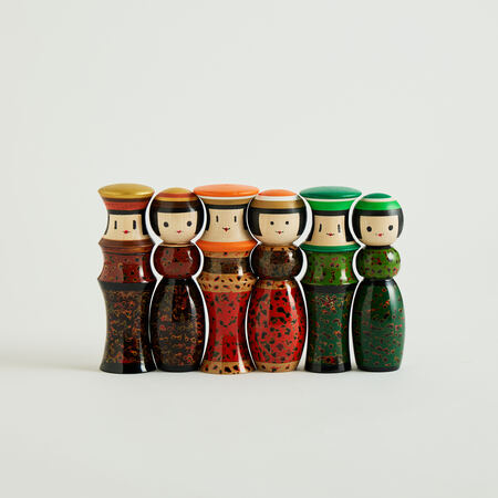 漆を何層も塗り重ね、研ぎ出すことで生まれる美しい模様が特徴の青森県の伝統工芸「津軽塗」。2体がぴったりと寄り添う「ルビンのこけし ペア」に、津軽塗の独特技法で生み出される4種の柄の中でも、複雑な斑点模様を描く「唐塗」を施しました。約50もの工程を、すべて手仕事で丁寧に仕上げた逸品です。