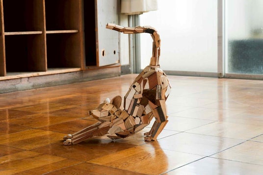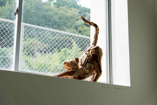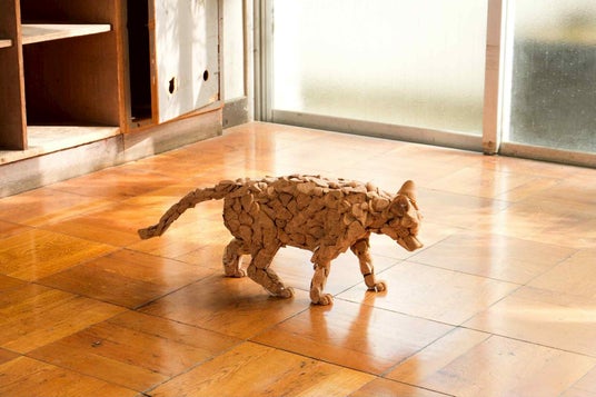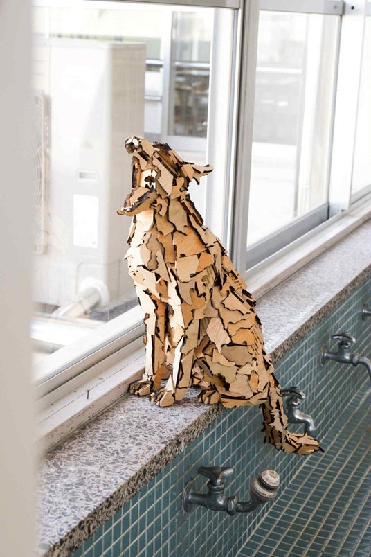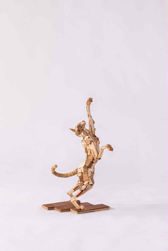 使用するのは、流木や家具の端材、建築現場で出る余り木など、役目を終えた木材です。無骨で角ばった木のブロックをパズルのように組み合わせる独自の手法で、驚くほど柔らかく、生き生きとした動物の曲線美を生み出します。