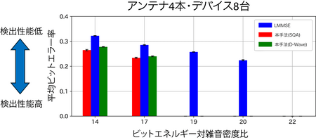 次に、本手法を無線通信実験系の基地局に実装し、屋外における電波発射実験を行いました(図3参照)。シミュレーションと同じく「基地局における受信アンテナ4本、QPSK信号(M=4)、接続デバイス数8台(K=8)」という条件下で、アニーリング手法としてはSQAとD-Wave量子アニーリング計算機の2つの手法に対して評価を行いました。実験の結果、本手法によって、SQAとD-Waveの双方の場合において、誤り率ゼロで信号検出可能であることを示しました(図4参照)。さらに実験を進め、10台のデバイスとの同時通信が可能であることも確認しています。これは、6Gで期待される多数接続性能の向上、すなわち「5Gと比べて接続デバイス密度10倍」の実現に本手法が貢献できることを実証したものです。
