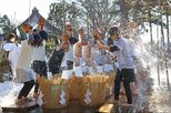 「島の推しごとグランプリ」表彰式の記念撮影で、盾を持つグランプリの萩原正人さん=佐渡市役所