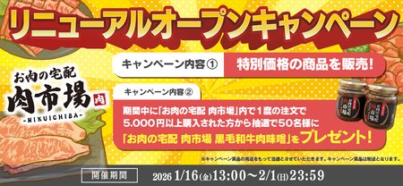 JA全農が運営する産地直送通販サイト「JAタウン」に出店する「お肉の宅配 肉市場」は、2026年1月16日リニューアルオープンいたします。リニューアルを記念して、特別価格の商品の販売や「お肉の宅配 肉市場 黒毛和牛肉味噌」が当たるキャンペーンを開催いたします。