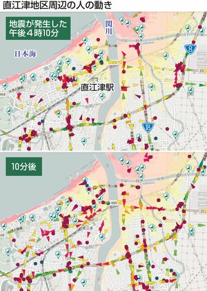 県内に津波が到達した2024年元日の能登半島地震で、上越市や新潟市の沿岸部や河口部で人々がおおむね迅速に避難を始めていたことが分かった。新潟日報社が専門家と、スマートフォンアプリの匿名化された位置情報を基に分析した。ただ、動き出すのに時間を要したケースや交通渋滞も各所でみられ、専門家は「避難の手段や行き先を把握しておいてほしい」と呼びかけている。