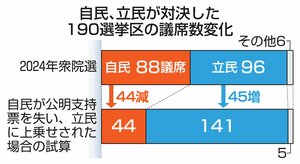 共同通信社は17日、立憲民主党と公明党による新党「中道改革連合」の結成を受け、公明支持層の票が自民党候補から立民候補に回ると仮定し、前回2024年衆院選の獲得議席への影響を試算した。自民と立民が対決した190選挙区のうち、自民が勝利した88の半数に当たる44で逆転を許す結果となった。全国で1選挙区当たり1万〜2万票とされる「公明票」の行方が注目される。