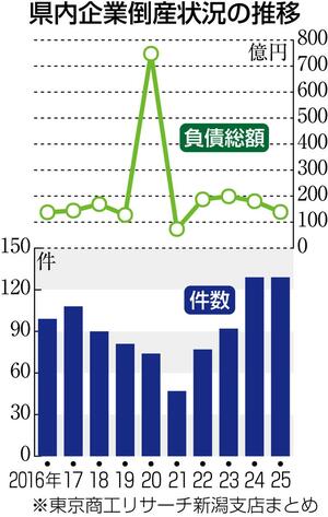 東京商工リサーチ新潟支店は2025年の県内企業倒産状況(負債額1千万円以上、任意整理含む)をまとめた。倒産件数は前年同期と同数の129件で、2年連続で100件を超えた。物価高や人手不足が影響した。負債総額は22・9%減の138億9100万円で、小規模な倒産が目立った。