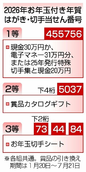 日本郵便は19日、2026年用のお年玉付き年賀はがきと切手の当せん番号を発表した。1〜3等の当せんはがきなどを郵便局の窓口に持ち込んで賞品と引き換える。引き換えは20日〜7月21日。