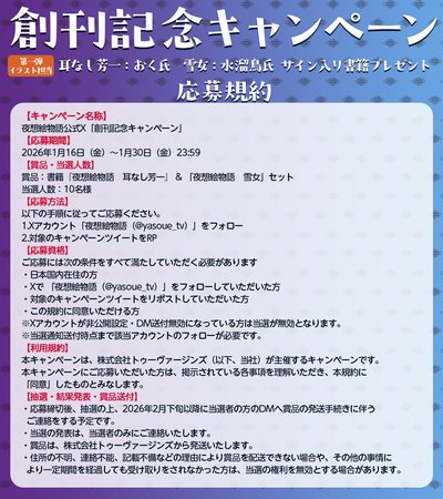応募方法:夜想絵物語公式Xアカウント(@yasoue_tv)をフォローしたうえで、キャンペーンの案内投稿をリポスト