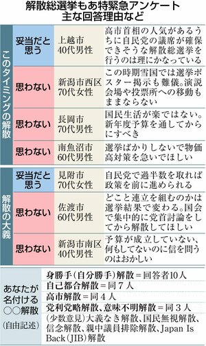 高市早苗首相は19日の記者会見で、23日召集の通常国会冒頭で衆院を解散すると正式に表明した。新潟日報社の「もっとあなたに特別報道班」(もあ特)は首相の表明に先立ち、通信アプリLINE(ライン)でアンケートを実施。解散のタイミングについて「妥当だと思わない」と回答した人は78%に上った。理由は「雪国にとって選挙活動や投票に支障が出る時期」などが目立った=表参照=。