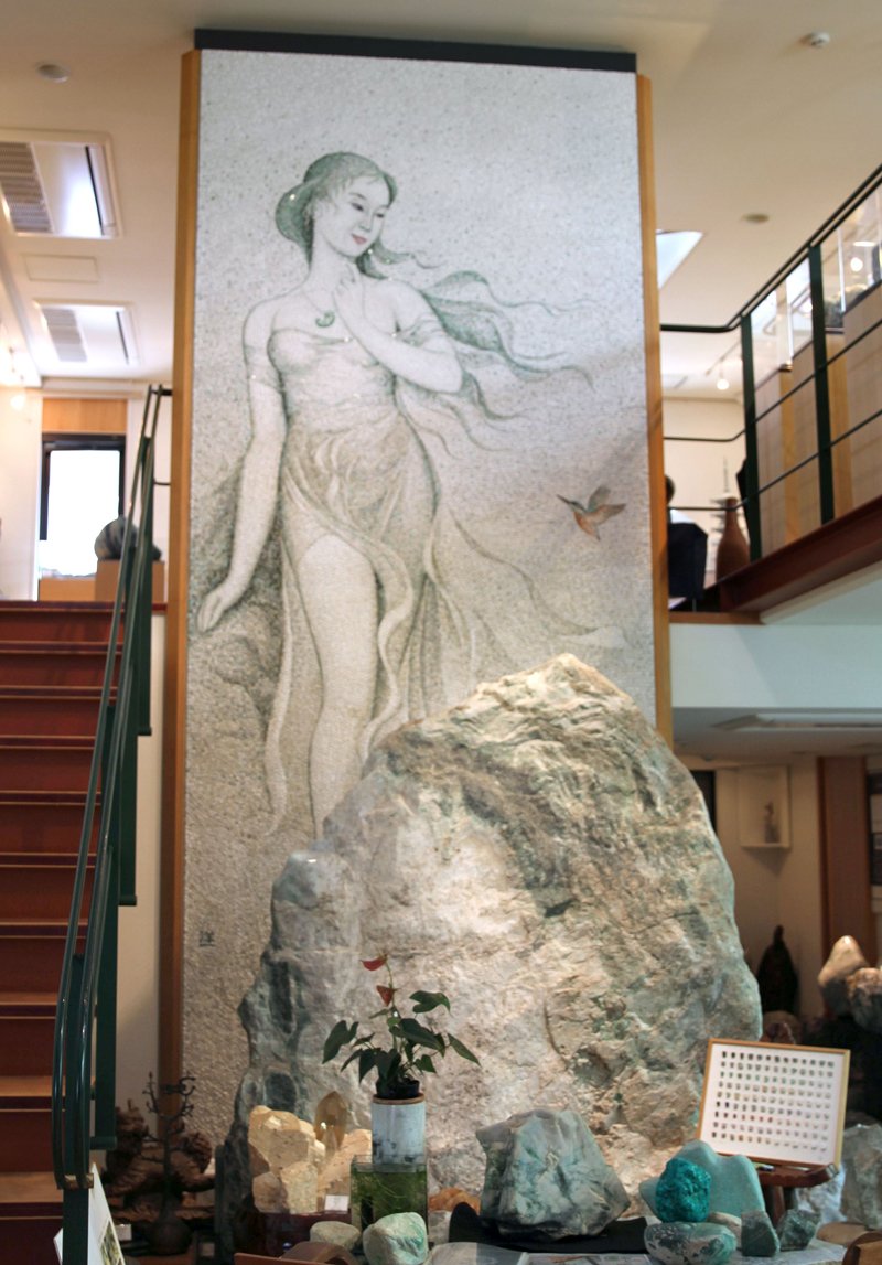 京浜急行の北品川駅から御殿山ヒルズを過ぎ、ゆっくり8分ほど歩くと、総ヒスイ製の立派なプレートが出迎える。玄関から吹き抜けのホールに足を踏み入れると目に飛び込んでくるのは、ヒスイや大理石など10万個以上の石を使った高さ5メートルの「奴奈川姫(ぬながわひめ)」のモザイク壁画...