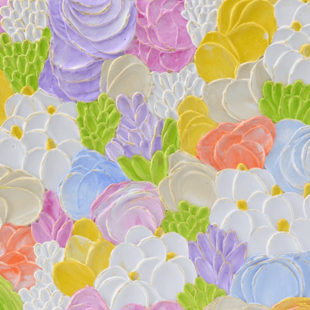 ③日常の中にある「身近な幸せ」に目を向け、制作しています。見る人それぞれの身近にあるものや出来事と重ねながら、ご鑑賞いただけましたら幸いです。凹凸や光沢があり、光の加減で作品の印象が変化します。角度を変えながら、近くでご覧ください。