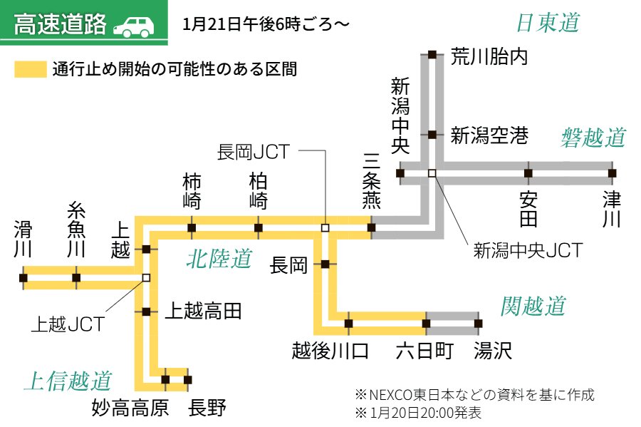 NEXCO東日本と国土交通省北陸地方整備局などは、強い冬型の気圧配置の影響で大雪が続く恐れがあるとして、21日午後6時ごろから、高速道路(北陸道、関越道、上信越道)と、国道(8、17、18、116号)で予防的通行止めを行う可能性があると発表した。