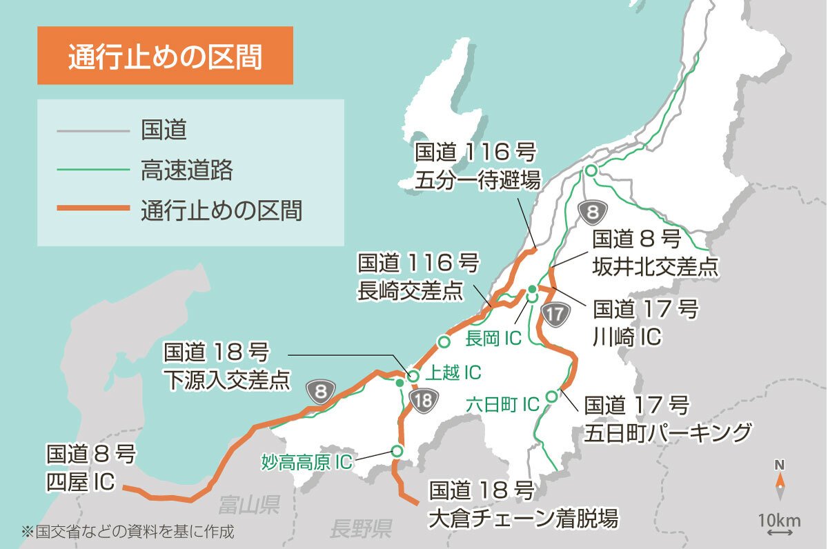 予防的通行止めを行った高速道路と国道の区間は以下の通り。