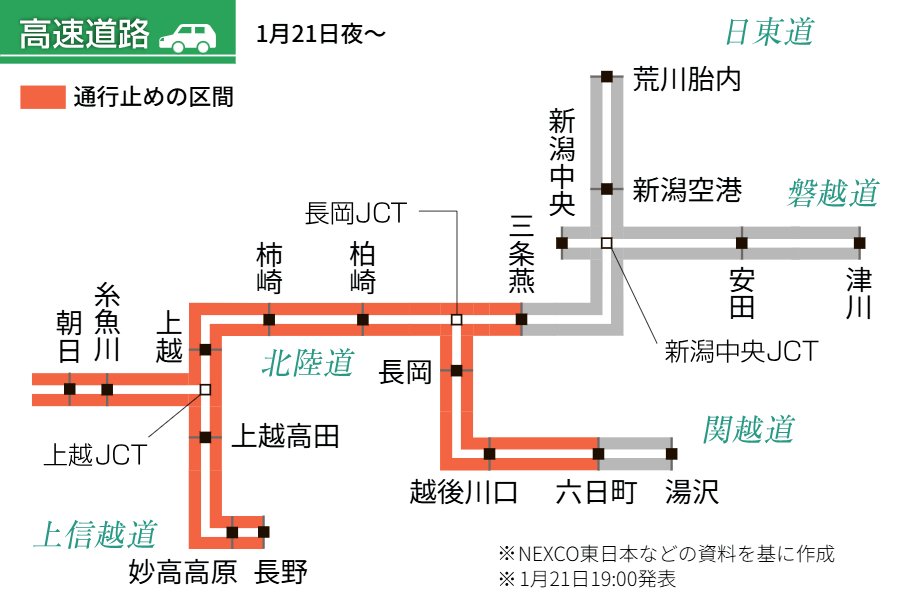 NEXCO東日本と国土交通省北陸地方整備局などは、強い冬型の気圧配置の影響で大雪が続く恐れがあるとして、21日午後8時から、新潟県内の高速道路(北陸道、関越道、上信越道)と、国道(8、17、18、116号)で予防的通行止めを実施したが、いずれも22日午前7時までに解除となった。