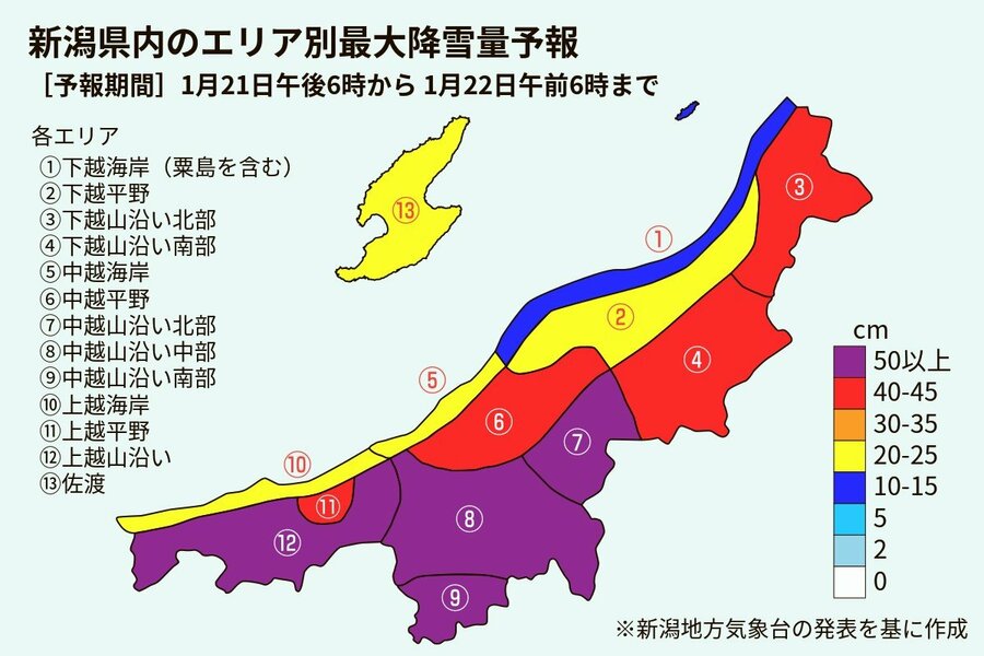 22日午後6時までに予想される24時間降雪量は、多い所で中越の山沿いが100センチ、平地が70センチ、上越の山沿いが80センチ、平地が50センチ、下越の山沿いが60センチ、下越の平地と佐渡で30センチ。