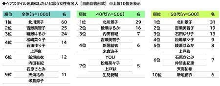 回答者の年代別にみると、40代回答者では1位「北川景子さん」(29名)、2位「綾瀬はるかさん」(16名)、3位「内田有紀さん」(7名)、50代回答者では1位「北川景子さん」(31名)、2位「吉瀬美智子さん」(19名)、3位「石田ゆり子さん」(13名)となりました。