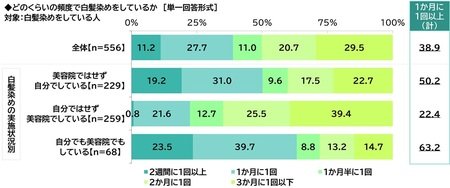 白髪染めの実施状況別に頻度をみると、『1か月に1回以上(計)』の割合は、白髪染めを美容院ではせず自分でしている人では50.2%となり、自分ではせず美容院でしている人(22.4%)と比べて高くなりました。白髪染めを自分でしている人は、美容院代がかからず経済的であるため自分で白髪染めをしているものの、色持ちがよくなかったり、染ムラができたりすることで染め直しが必要になり、白髪染めの頻度が多くなっているのではないでしょうか。