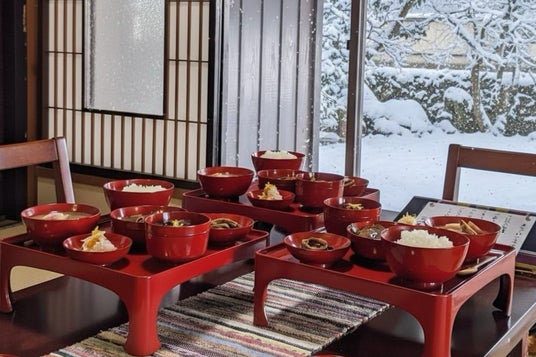 築300年を超える古民家を舞台に、佐渡の風土と暮らしから生まれた郷土料理を味わう体験プログラムも実施します。建物や生活道具の案内を通して島の歴史や人々の営みに触れた後、かつて蔵に納められていた朱塗りのお膳で、佐渡食材を使用した旬の郷土料理を楽しみます。観光としての「食」ではなく、佐渡の暮らしの延長線上にある文化としての食と精神性を体感できる内容です。