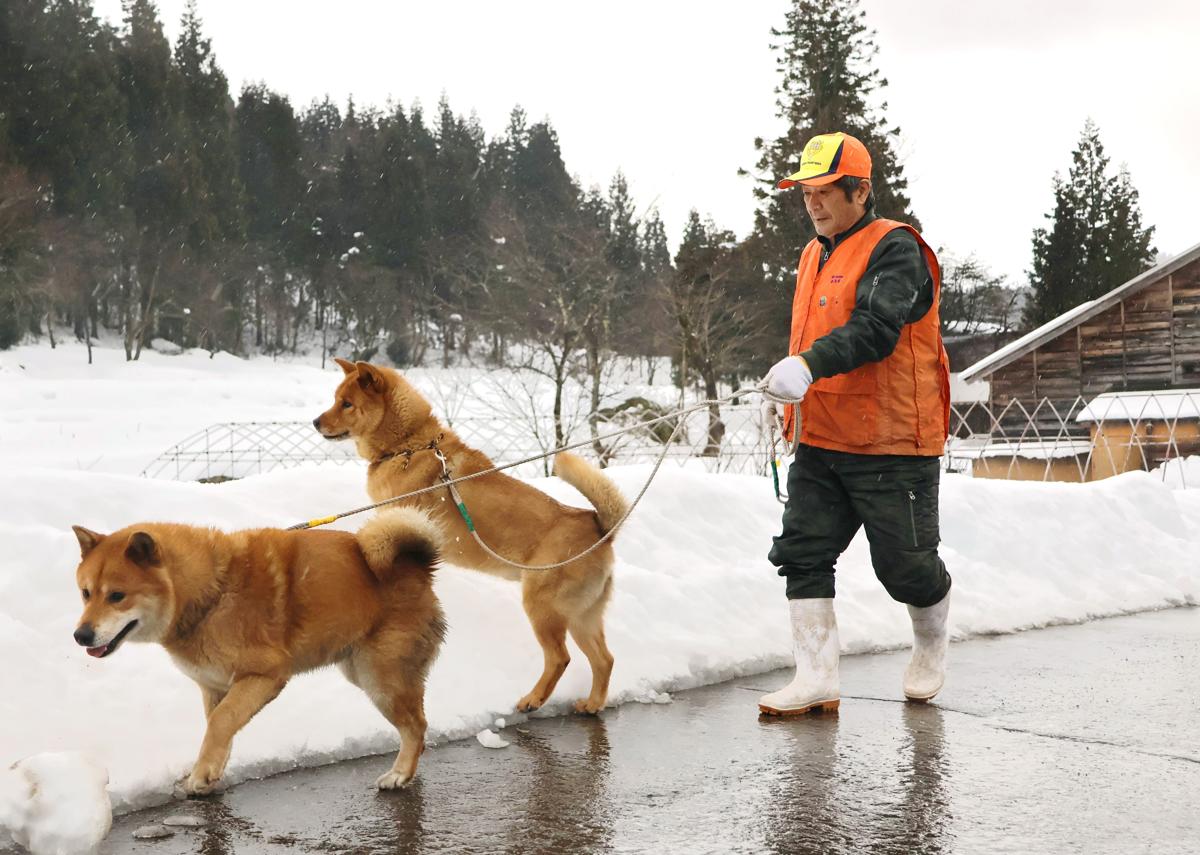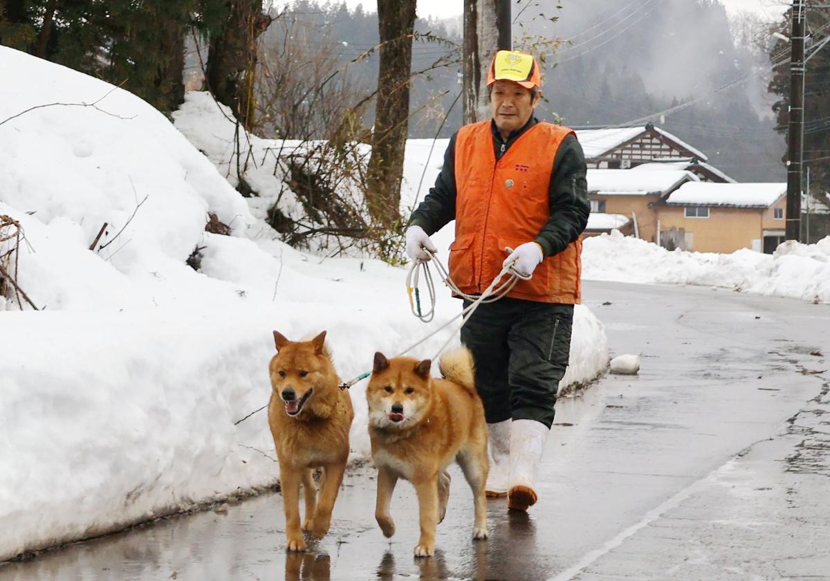 「よーし。行ってこーい」。加茂市上高柳集落で暮らす中村長雄さん(74)がかんじきを履き、銀号(雄10歳)と虎鉄号(雄8歳)の梓山犬の親子と共に集落近くの山を中腹まで登ると、まず銀号を放つ。