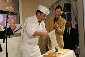 ダボス会議は、世界各国から著名な経営者や政治家、学識者が集う貴重な機会です。この機を捉え、 寿司職人による寿司握りの実演のほか、チューリッヒの和食レストラン「BIMI」(日本産食材サポーター店)の協力を得て、日本人和食料理人による国産の農林水産物・食材の魅力を生かした料理を提供し、各国のゲストに日本のさまざまな食文化を楽しんでいただきました。具体的には、和牛を使ったローストビーフ、すき焼きなどの温かい料理や、ブリ・ホタテなど素材の味を生かした海鮮料理、また、粘りがあり、冷めてもおいしい日本産米の特徴を生かしたおにぎりなども提供しました。さらに、今年は京都の割烹・懐石料理店「水簾」総料理長による、日本の食文化の紹介と、伝統的な包丁技法である「かつらむき」を実演。華麗な包丁さばきによって完成した美しい飾り包丁作品に、ゲストは拍手を送り、会場を盛り上げました。 2026年は東日本大震災の発災から15年という節目の年でもあり、福島県産の桃ジュースや県産酒も用意するなど、日本国内のさまざまな地域の食文化・魅力を堪能いただく機会となりました。