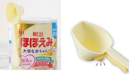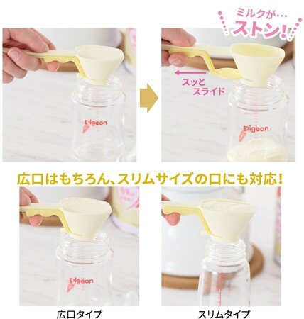 本商品は、調乳時の「あれ、粉ミルク何杯入れた?」を解消する、すりきり1杯(約13.5g)でミルク100mL(※)分の粉ミルクが量れる計量スプーンです。スプーンの底がスライドして開くため、スプーンをひっくり返す必要がなく、粉ミルクをこぼさずにほ乳びんに入れることができます。