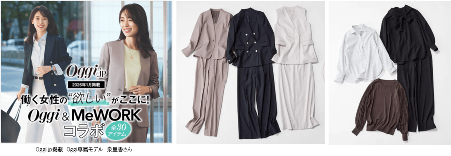 トップスは、ブラウス・シャツ・ニットと豊富なデザインバリエーションで展開。今年は新たに結び方をアレンジできるボウタイ付きのブラウスとパンツのブラウスセットアップをご用意しました。1着でも華やかに着られるデザインかつ、ジャケットとの組み合わせで朝のスタイリングが簡単に決まります。「Oggi.jp」では、MeWORK®とのコラボアイテムを使用したコーディネートをご紹介するなど、みなさまに春夏の装いの楽しさをお伝えしております。