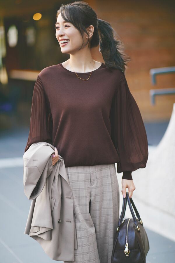 スーツの着こなしを垢抜けて見せてくれる、シーンを選ばないちょうどいい華やかさをオッジェンヌの皆さんと共に考え抜いて完成したニット。ジャケット合わせのインナーとしてもたつかない袖のボリュームや、適度な開きのクルーネックデザイン。