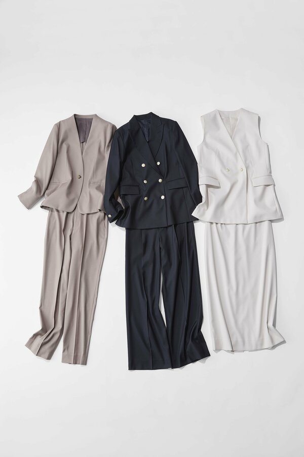 ジャケットはノーカラーとダブルブレストデザインの2型、ボトムはすっきりとした装いが叶うストレートパンツと、ハンサムなワイドパンツ、上品なロングタイトスカートの3型をご用意。ジレも加わり様々な着こなしがお楽しみいただけます。ベーシックな紺色、春らしさを感じるオフホワイトとベージュの3カラーを展開。