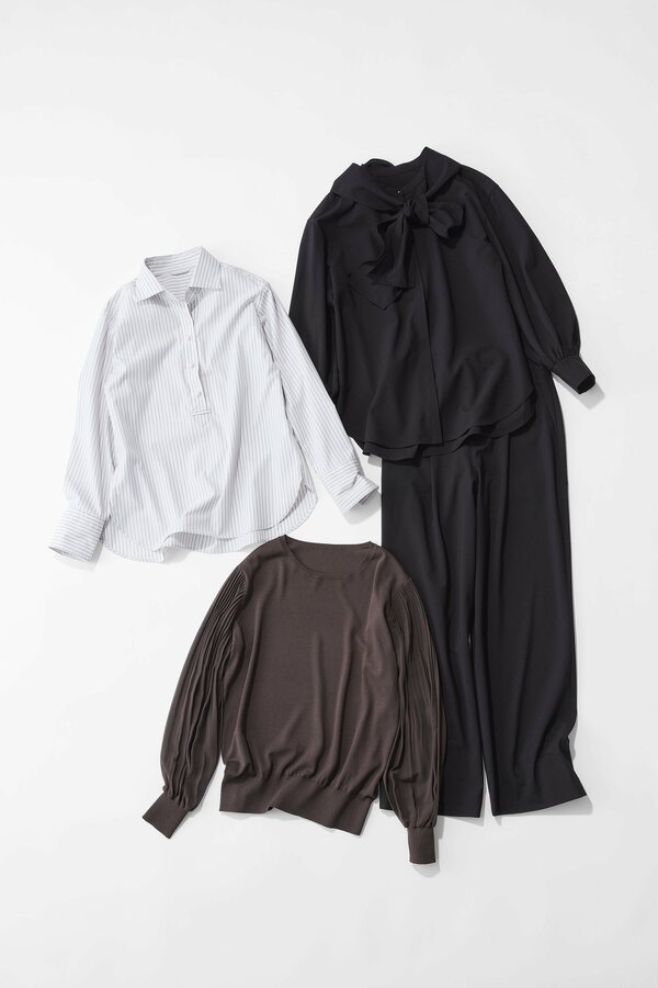オッジェンヌの皆さまから毎朝のコーディネートに迷わず、簡単にお洒落見えするセットアップが欲しいという声から生まれた商品。ブラウスは結び方を