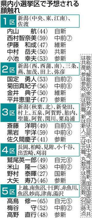 衆院が23日解散され、厳冬の県内でも超短期決戦に事実上突入した。23日現在、県内5小選挙区に前職7人、新人10人、元職2人の計19人が立候補する見込み。全5小選挙区で自民党と、立憲民主、公明両党による新党「中道改革連合」が激突。自民と連立を組む日本維新の会に加え、国民民主、共産、参政の各党が切り込む構図だ。県内では前回選で全勝した野党が勢いを保つのか、高市政権の高支持率を背に自民が巻き返すのか。各陣営の戦いと新党の影響に注目が集まる。