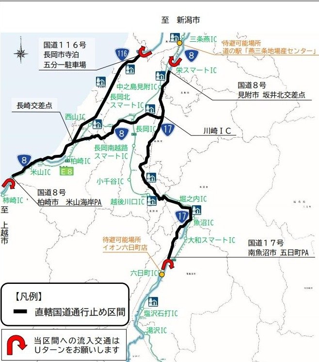 国土交通省北陸地方整備局長岡国道事務所によると、大雪による集中除雪のため、23日午後9時から、国道8号、国道17号、国道116号で通行止めを実施すると発表した。