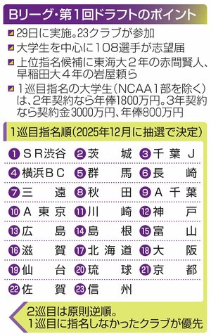 ドラフトは秋にスタートする新トップカテゴリー「Bリーグ・プレミア」に向けたもので、第1回に参加するのは、プレミア全26クラブのうち、不参加を決めた一部を除く23クラブ。1巡目指名順は昨年12月に抽選で決まり...