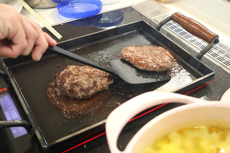 スープは具材がやわらかくなるまでしばらく放置。その間に同時進行で、ハンバーガーのパティを焼きます。フライパンを180度になるよう設定すると、ほどなくピピピッと音がして余熱完了のお知らせ。温まった鉄板にお肉をのせ、ジュージューと音を立てながら焼き上げます。