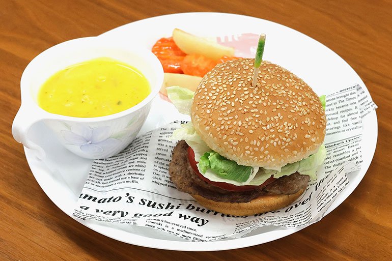 - バンズに4を塗り、バンズ、パティ(5)、トマト、レタス、マヨネーズ、バンズの順に重ねる。