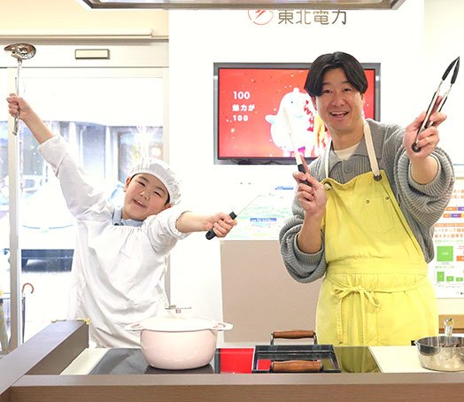 二人でおじゃましたのは、新潟西総合住宅展示場(新潟市西区)にあるIHクッキングヒーターのショールーム。「こんにちはー!」と笑顔で迎えてくれたのは東北電力Eライフ・パートナーズのホームアドバイザー・西脇峰子さん。「IHならタッチ画面の簡単な設定だけで火加減も調理時間も教えてくれるから、料理が苦手な人やお子さまでも、誰でもおいしく作れちゃうんですよ。料理をしたことがない春くんでも大丈夫!」。そう言われてちょっと安心。向かい合って「よろしくお願いします!」とお辞儀をしたら早速料理スタート!
