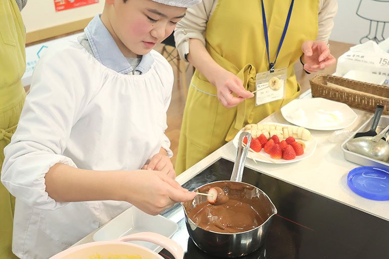調理のシメはデザート用の「チョコレートフォンデュ」。いつもなら湯せんでチョコを溶かすけど、弱火も得意なIHならとろ火の設定ができるので、湯せんしなくてもチョコを溶かすことが可能なのだ。おみそ汁を温め直す時も便利だね。