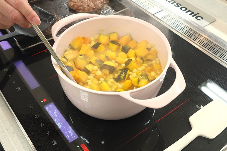 クッキングヒーターの天面に鍋を置いて、まずは「かぼちゃとコーンのスープ」の調理から。かぼちゃとコーン、タマネギを鍋に入れて炒めたら、水を足して火加減と時間を設定。