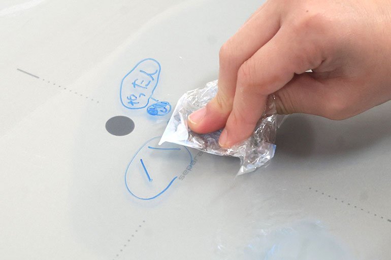 IHのすごいところは、お手入れも簡単なところ。飛び散った油は布巾でサッと拭き取るだけで調理前の状態に。落ちにくい汚れはクリームクレンザーを付けてラップでこすれば元通り。「実験してみよう」と言われて、油性マジックで描いた落書きも、サッとこするだけでなくなっちゃった! すごい!