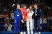 ▲柔道女子48キロ級競技終了後にビクトリーセルフィーを撮影する選手たち。(左から)モンゴル代表で銀メダリストのBaasankhuu Bavuudorj 選手、日本代表で金メダリストの角田夏実選手、フランス代表で銅メダリストのShirine Boukli 選手と、スウェーデン代表のTara Babulfathx選手。(写真:Patrick Smith / Getty Images)